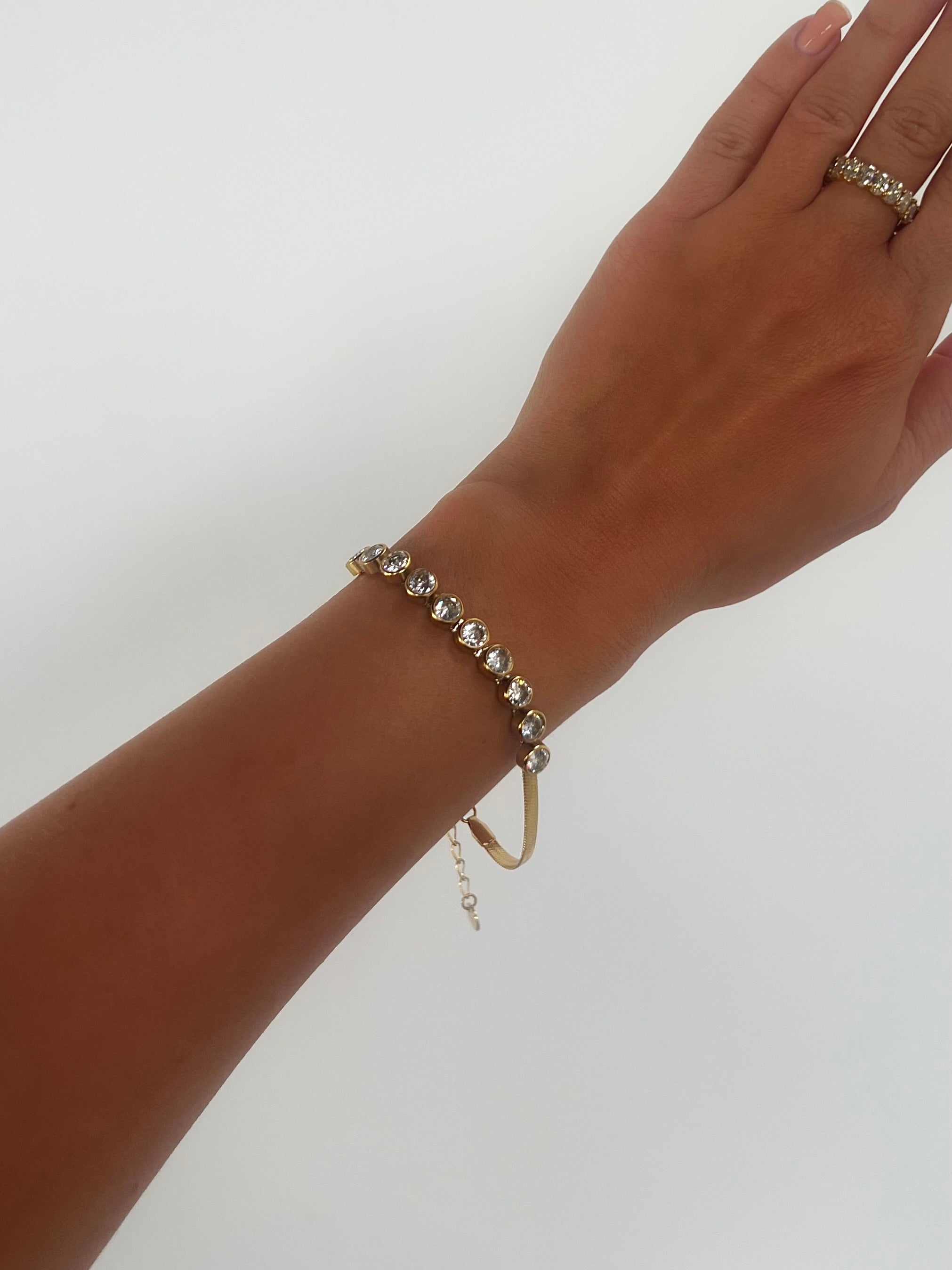 This bracelet is crafted with a luxurious 18k gold plating, offering a rich, warm glow that complements any skin tone. The bracelet features a sleek and modern design. The durable gold plating provides lasting beauty and resistance to tarnish.
