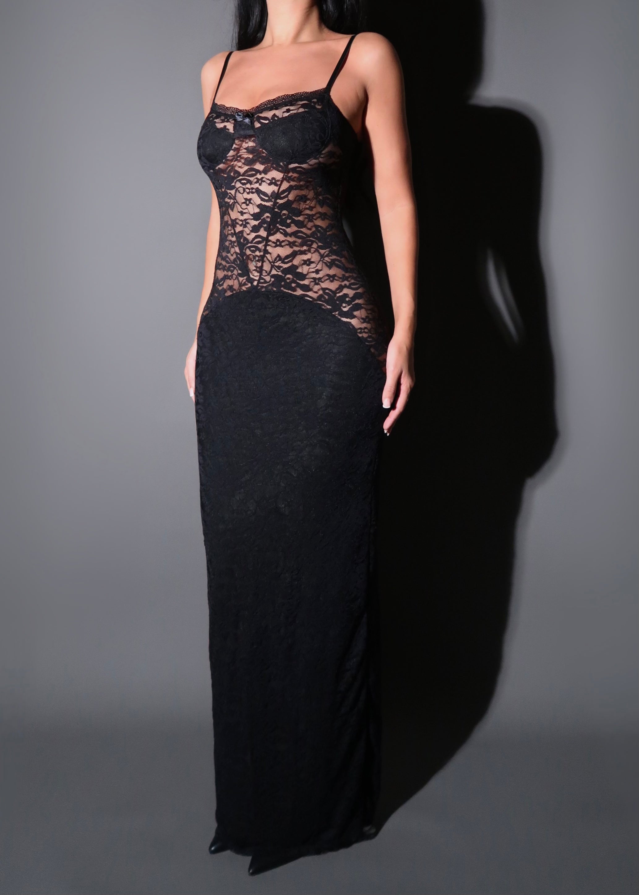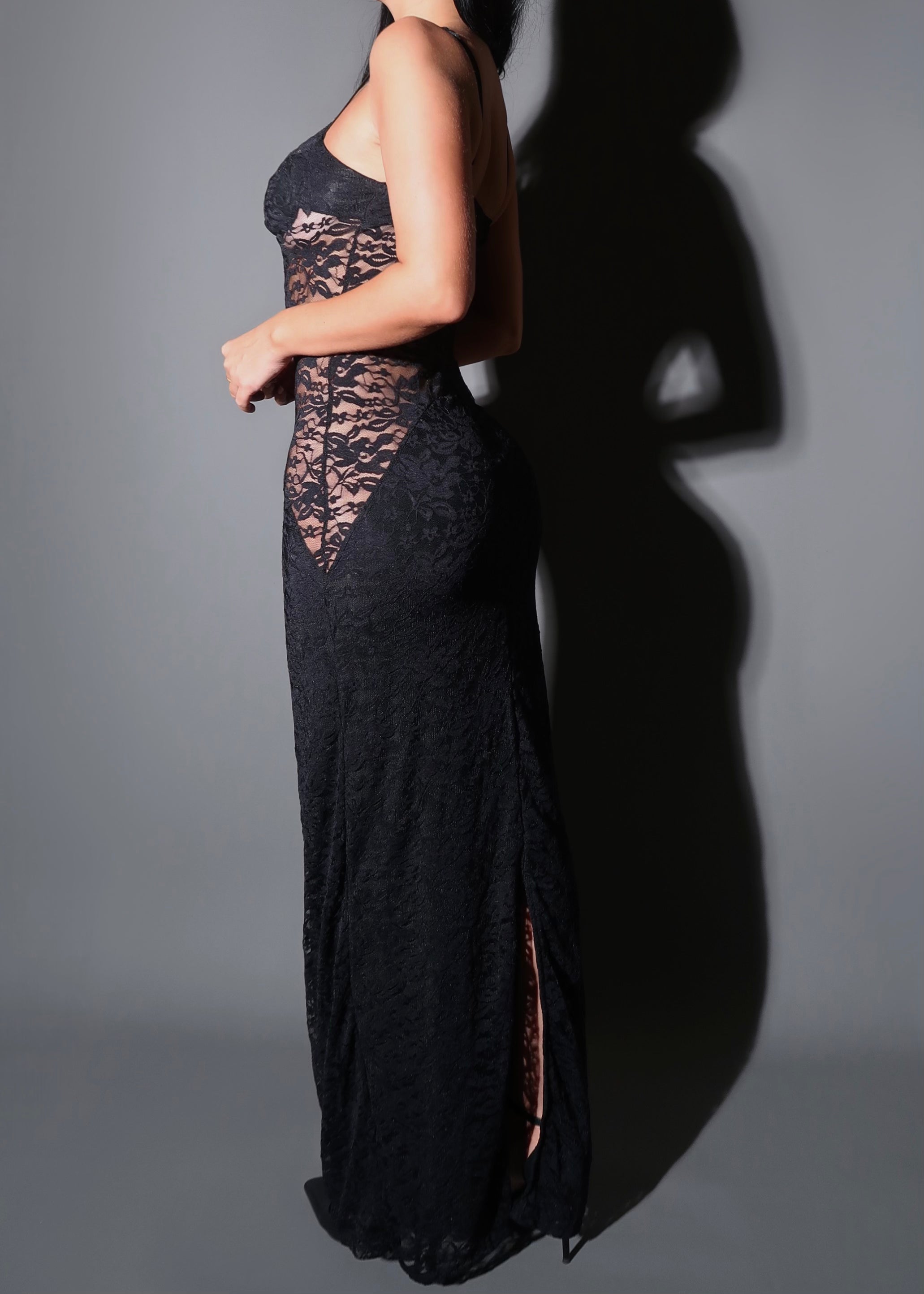 Made from our luxurious lace fabric for a premium feel. Designed for sculpting curves.  LINA features a black lace fabric with a lace tie side detailing, sculpting design & maxi length.