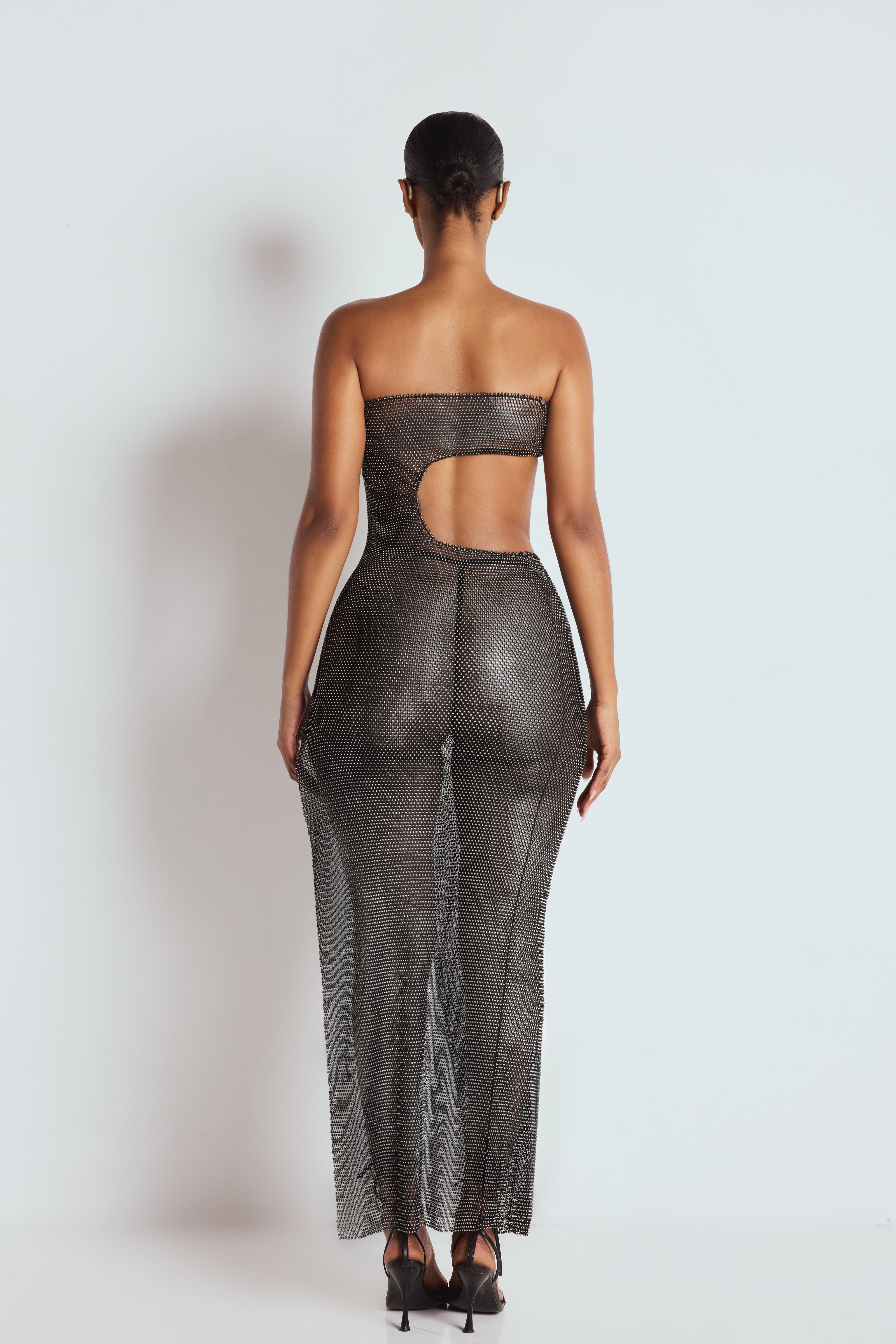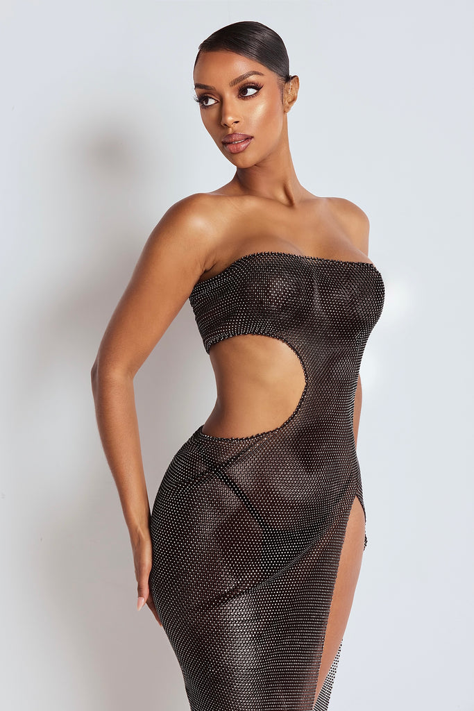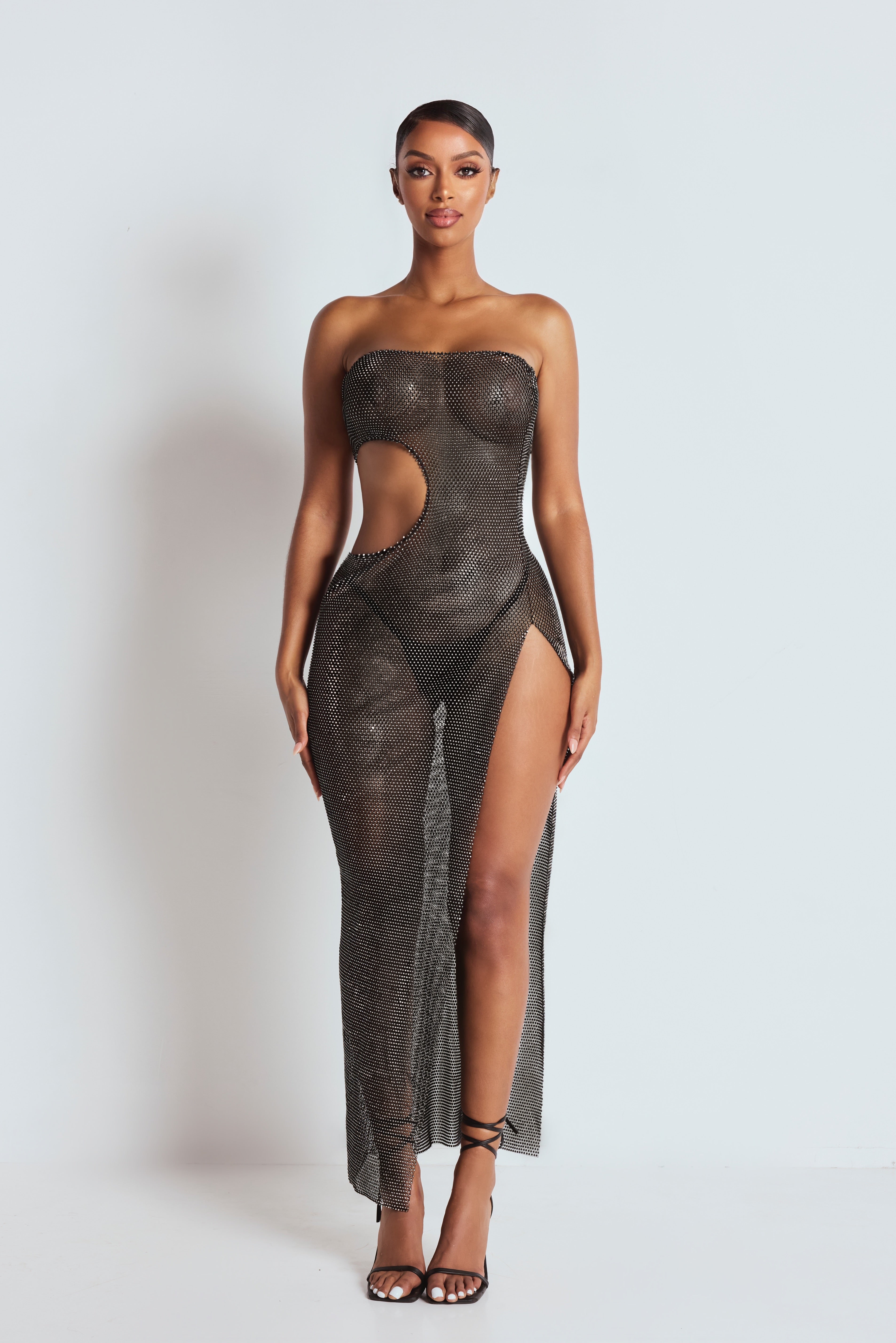 Unleash your inner siren with our Aurea cut out diamante maxi dress, a bold masterpiece made for the spotlight. Designed to captivate from every angle, this gown features a strapless silhouette adorned with sparkling rhinestone embellishments that shimmer like liquid light. A daring side cut-out and thigh-high slit sculpt the body and elongate the legs, while the floor-length hem adds red-carpet-worthy drama. Crafted from a stretch mesh base that hugs every curve, this dress ensures both comfort and undeniable allure. Perfect for upscale events, galas, and unforgettable nights out.