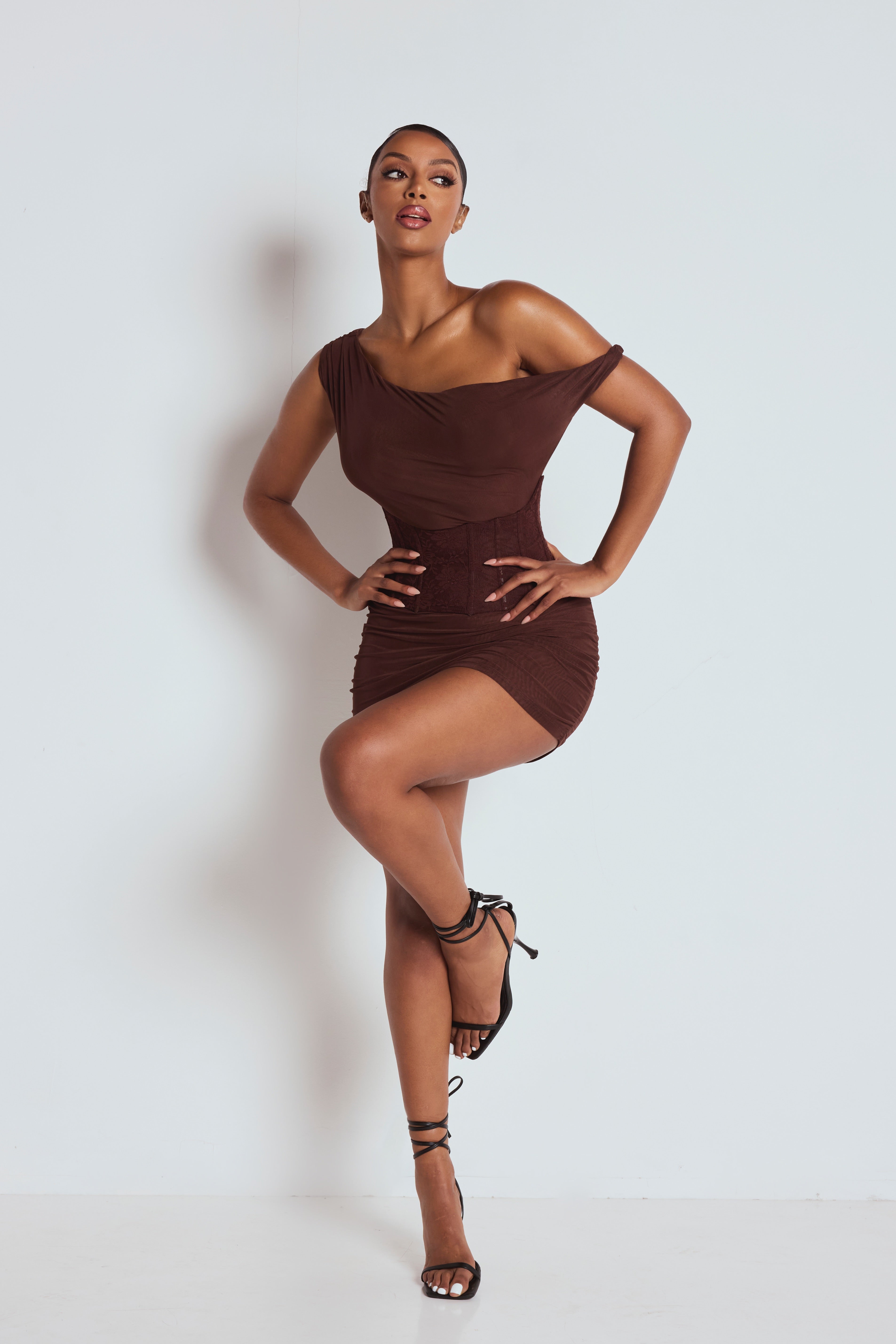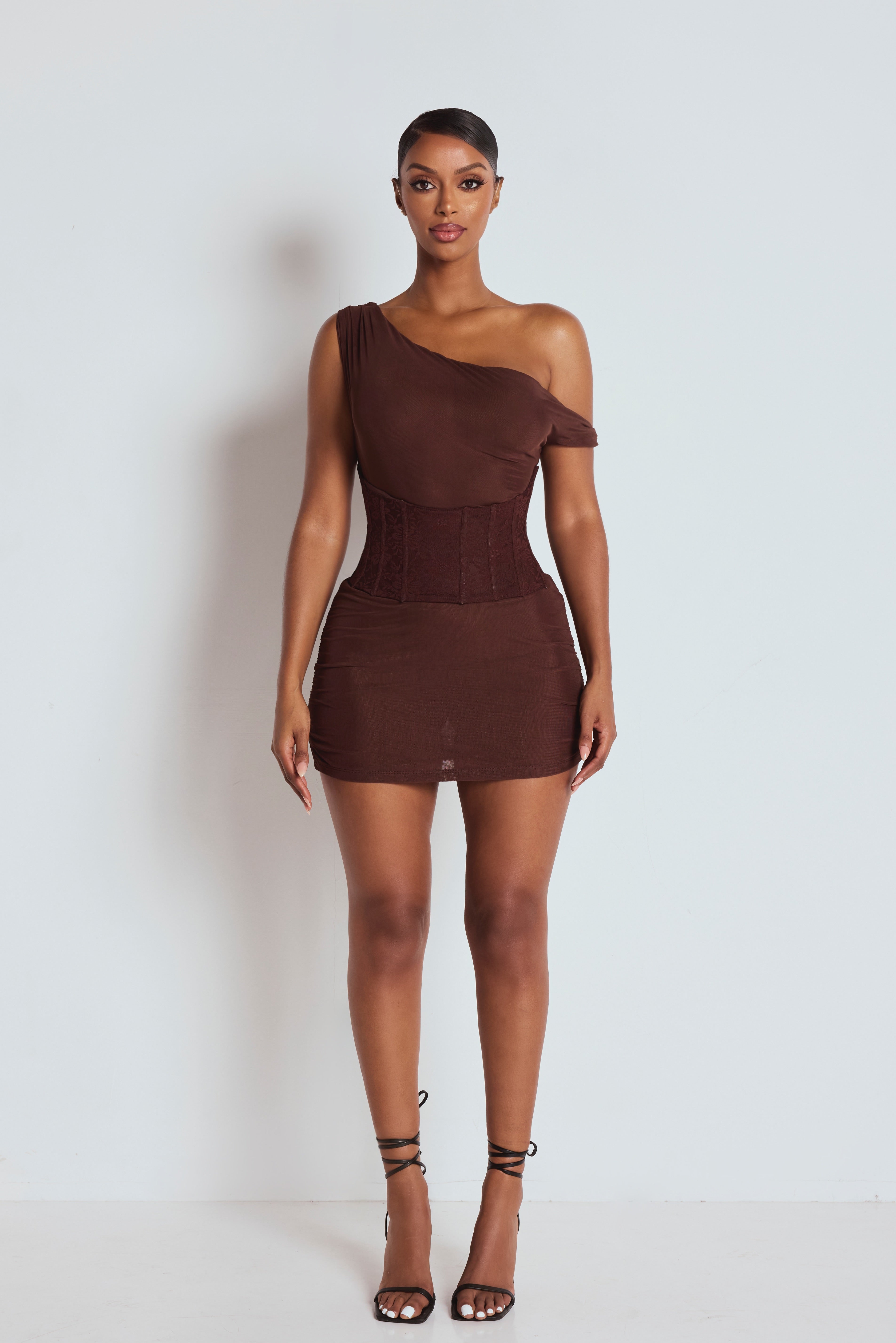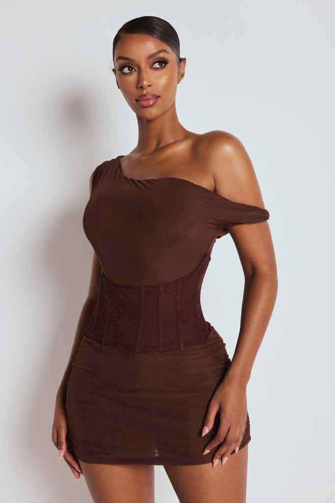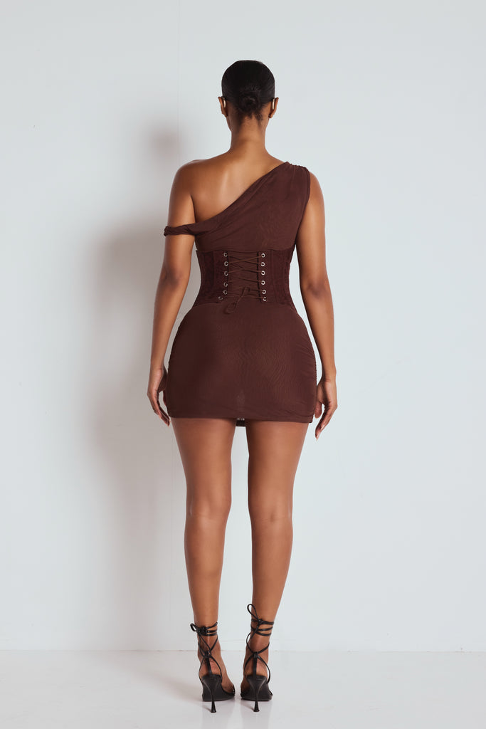 Made from our luxurious mesh fabric for a premium feel. Designed for sculpting curves. AURELIA features a brown mesh fabric with a lace corset waist, sculpting design & mini length.