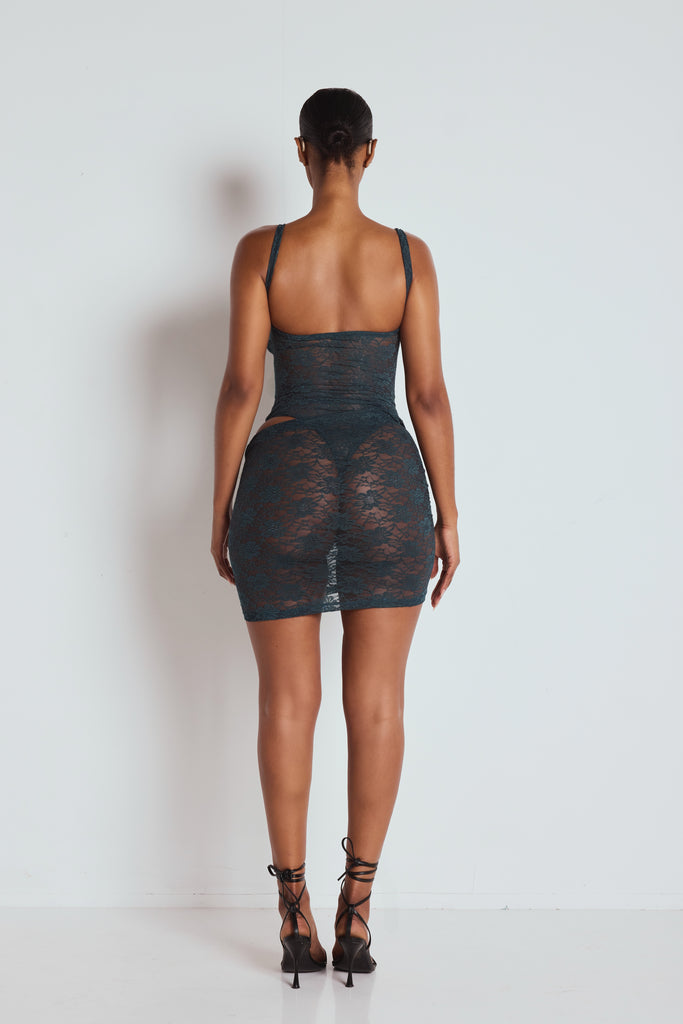 Made from our luxurious lace fabric for a premium feel. Designed for sculpting curves. INESS features a green lace fabric with a draped waist, sculpting design & mini length.