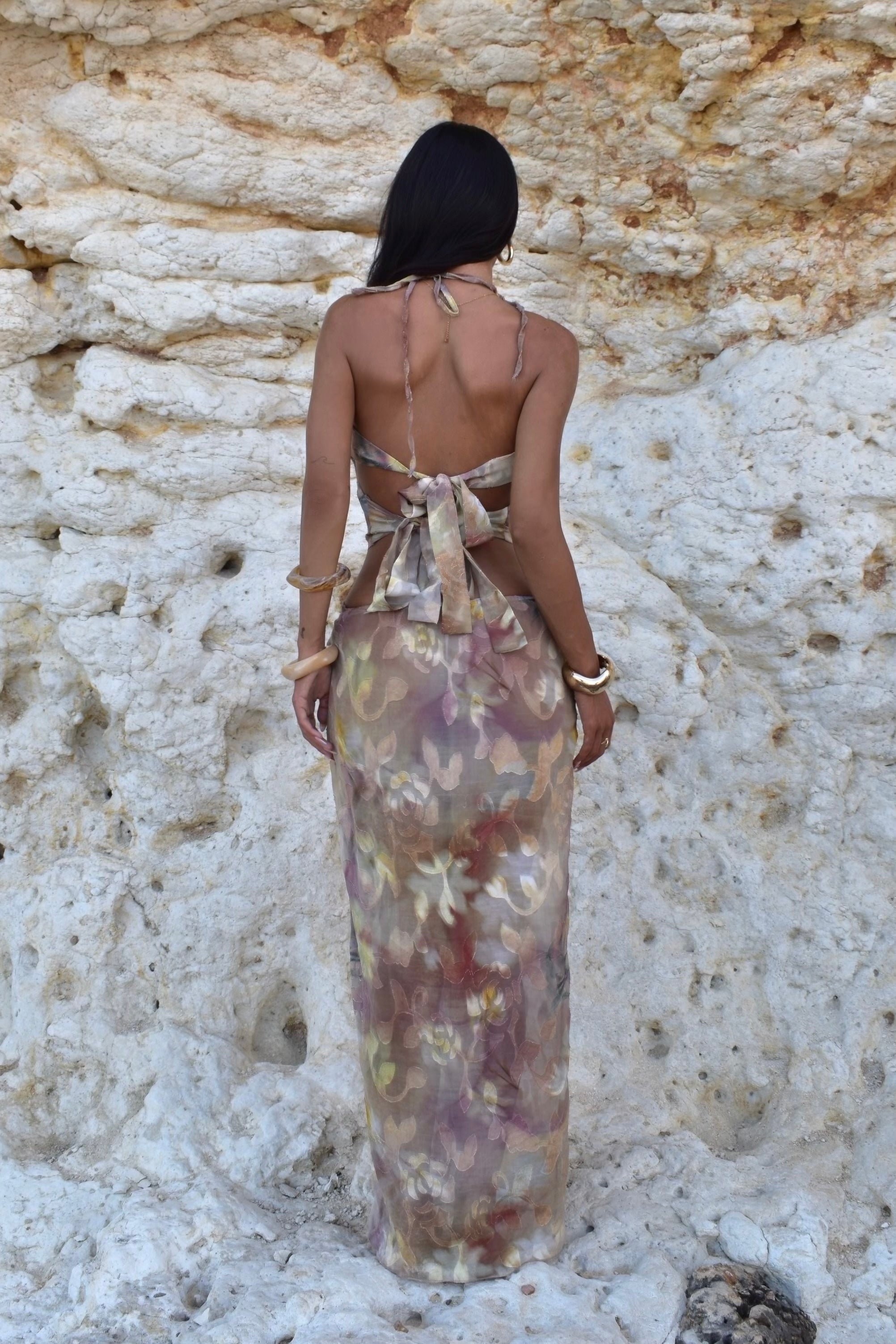 Hand-draped with a flattering twist knot detail and a luxe, sculpted halter bodice embellished with hand-selected bead accents, this dress transitions seamlessly from beachside lounge to moonlit soirée.