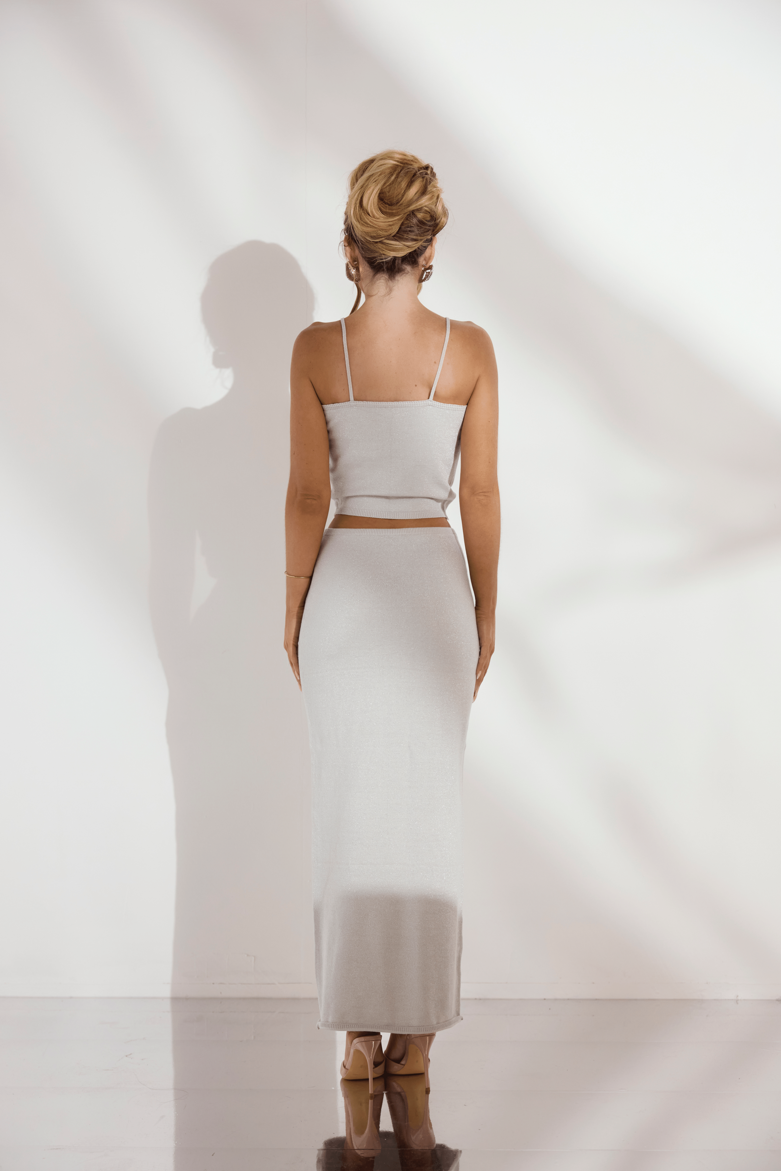 We are all about the knit feels this season and this set is about to earn you some serious style points. Featuring a light grey glitter knit material with a cute crop top and a matching maxi skirt.