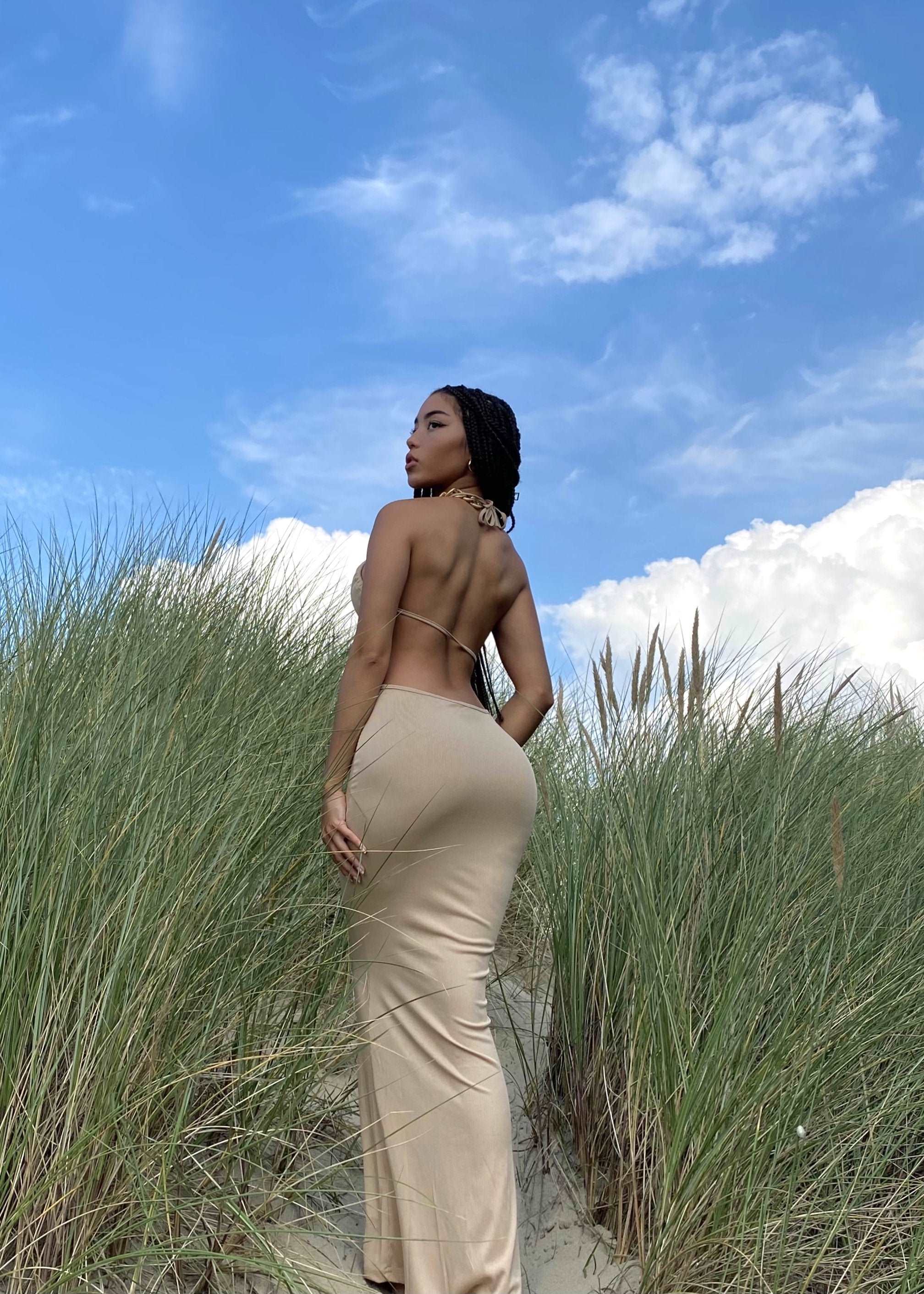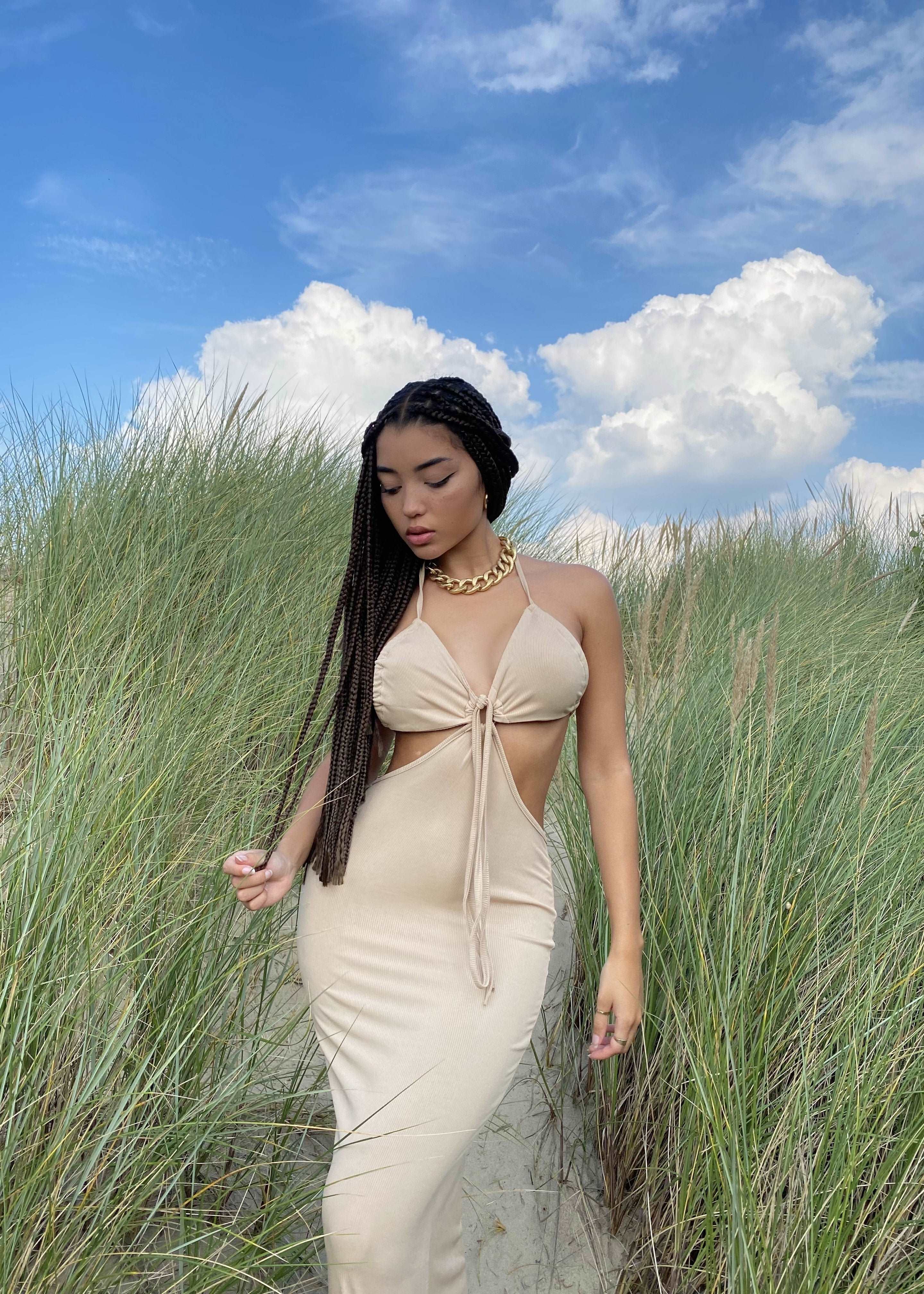 We're loving this midi dress for your collection. Featuring a nude ribbed material with a hoop tie bust design and a draped front detail.