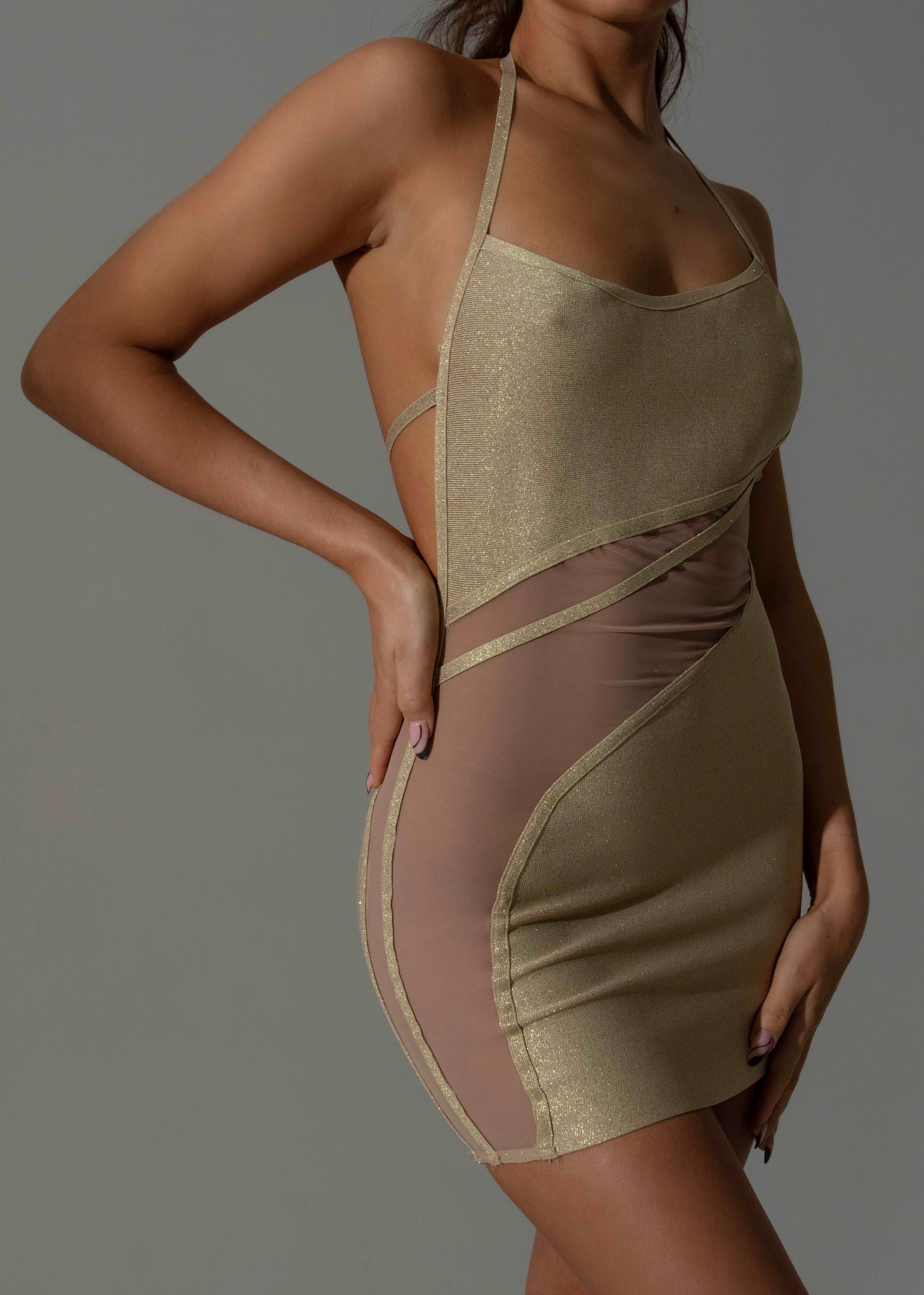 Turn heads for all the right reasons in this dress. Featuring a beige glitter material with a halterneck style, mesh detail and a mini length, we are obsessed.