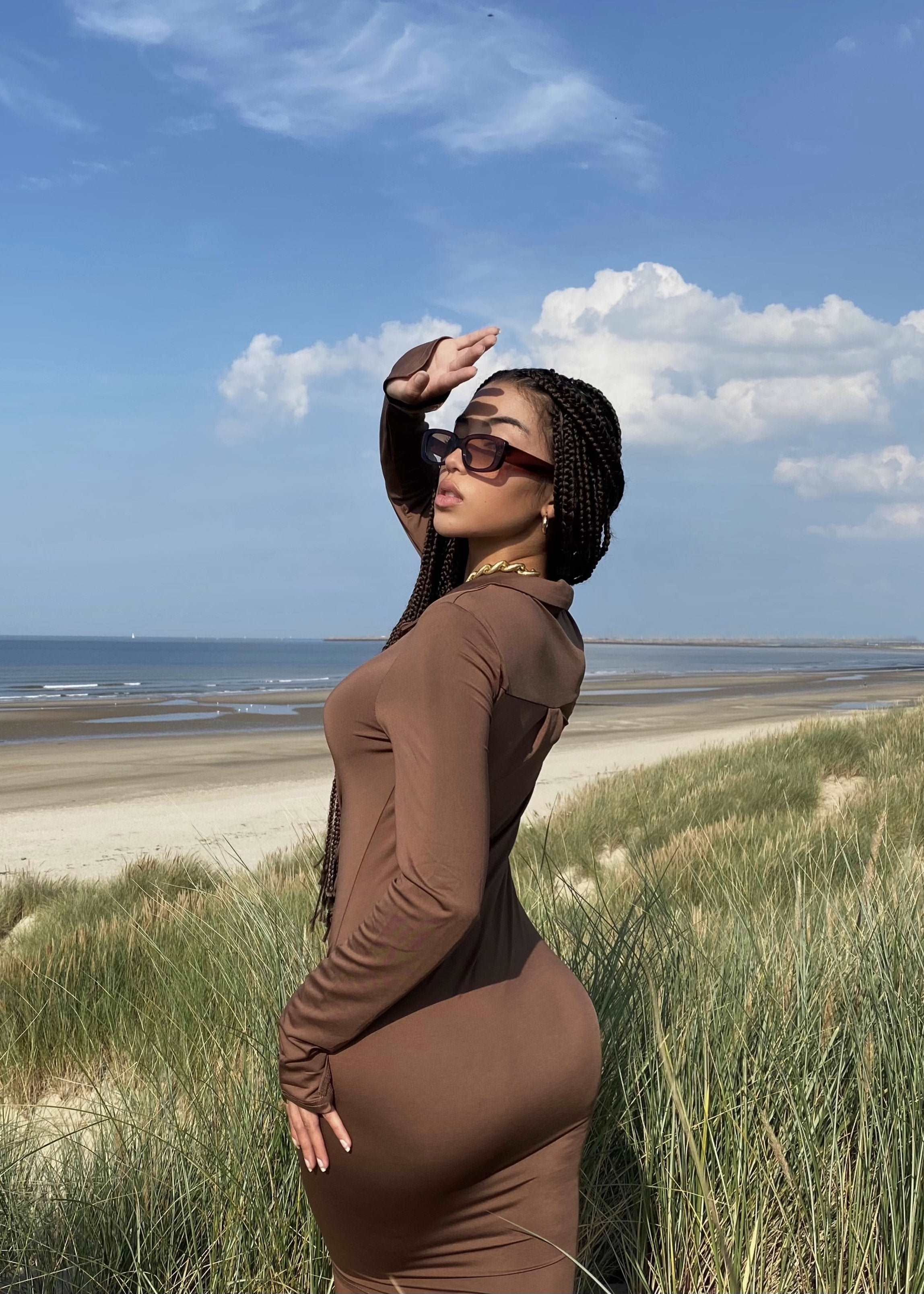 Make your look casual but chic with this shirt dress. Featuring a brown material with ruched detailing and button-through design.