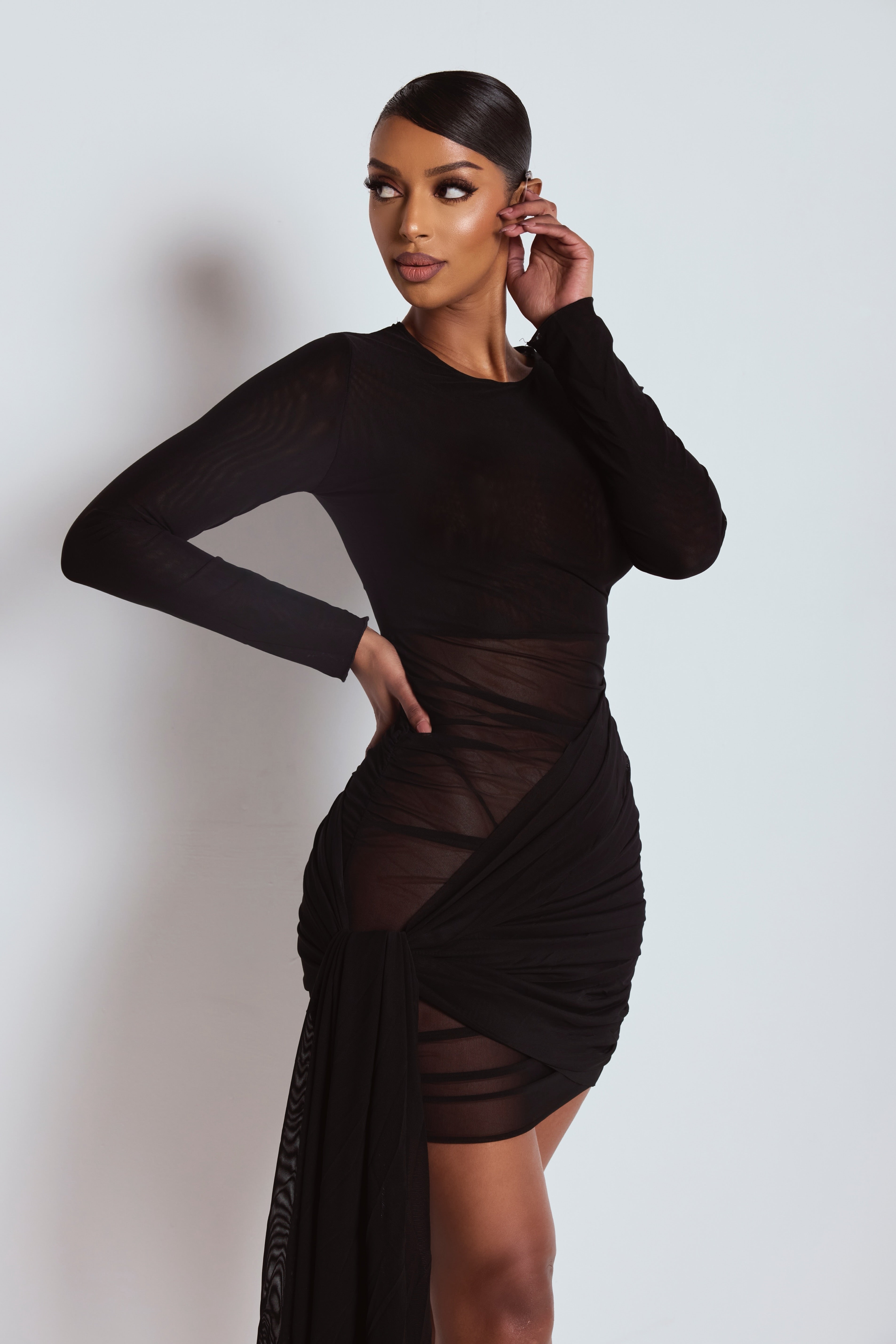 Made from our luxurious mesh fabric for a premium feel. Designed for sculpting curves. DIYA features a black mesh fabric with a mesh tie side detailing, sculpting design & mini length. (Under bodysuit not included)