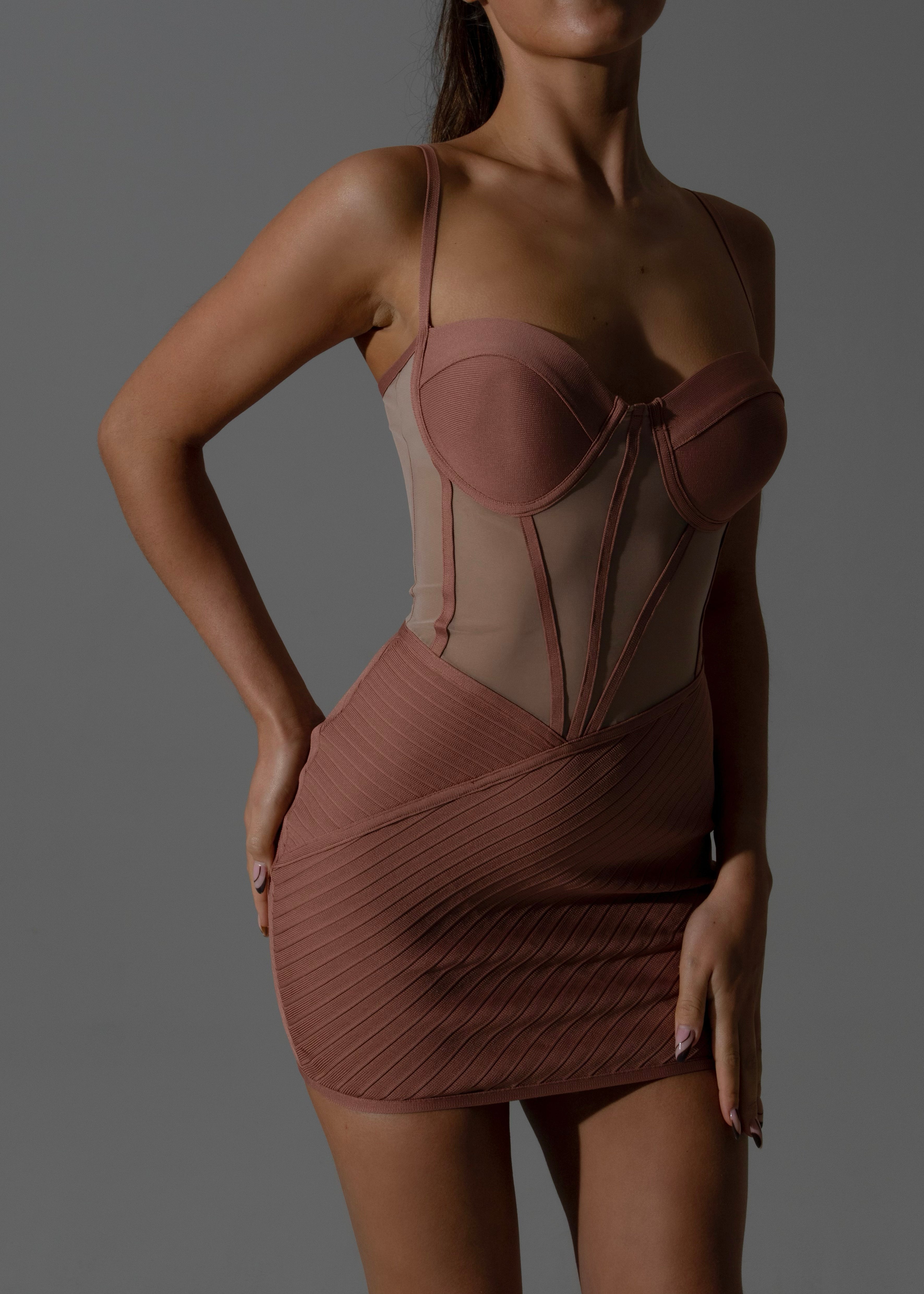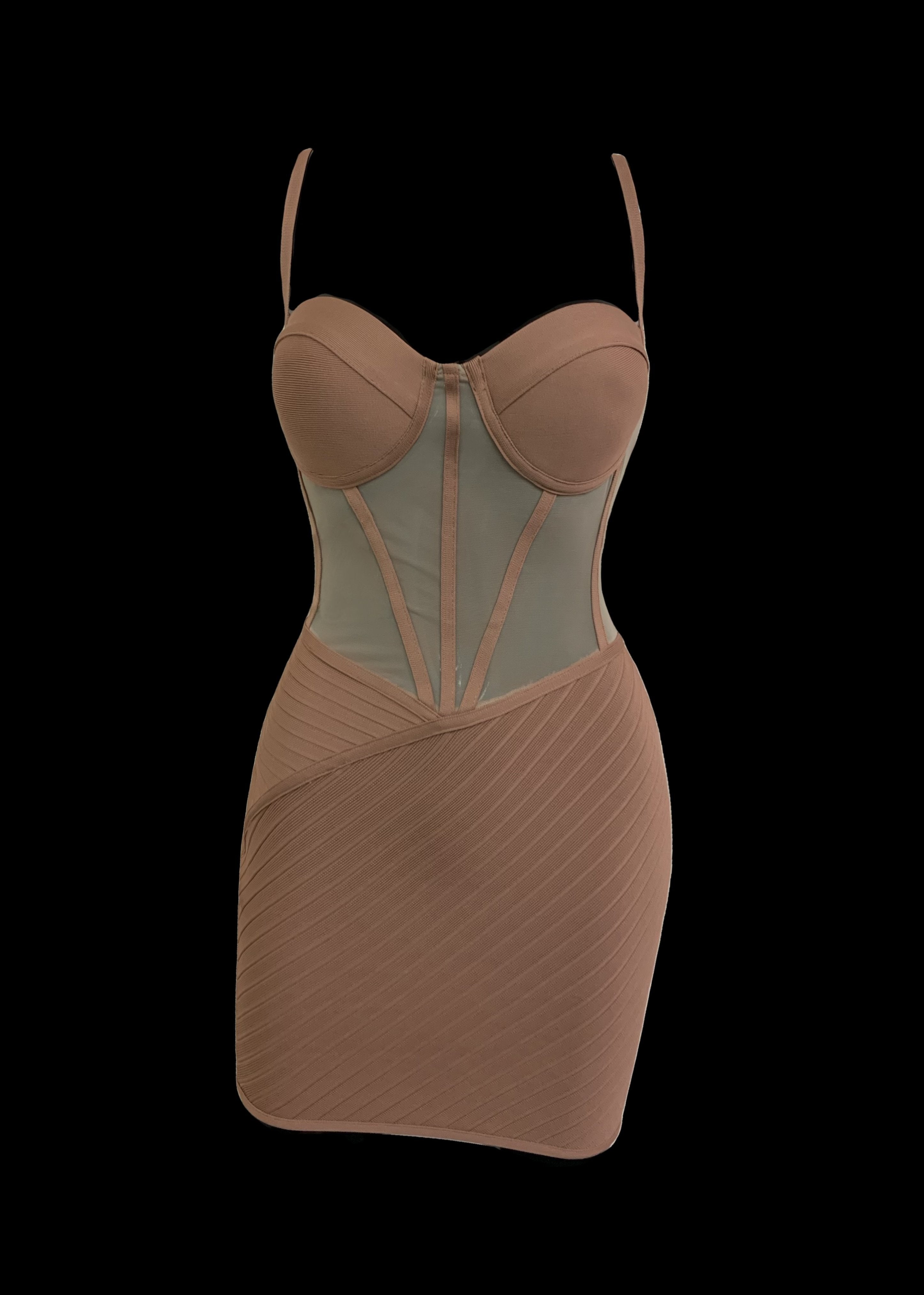We are dreaming over this totally on trend bodycon dress. Featuring a blush bandage material with cup detailing and mesh waist.