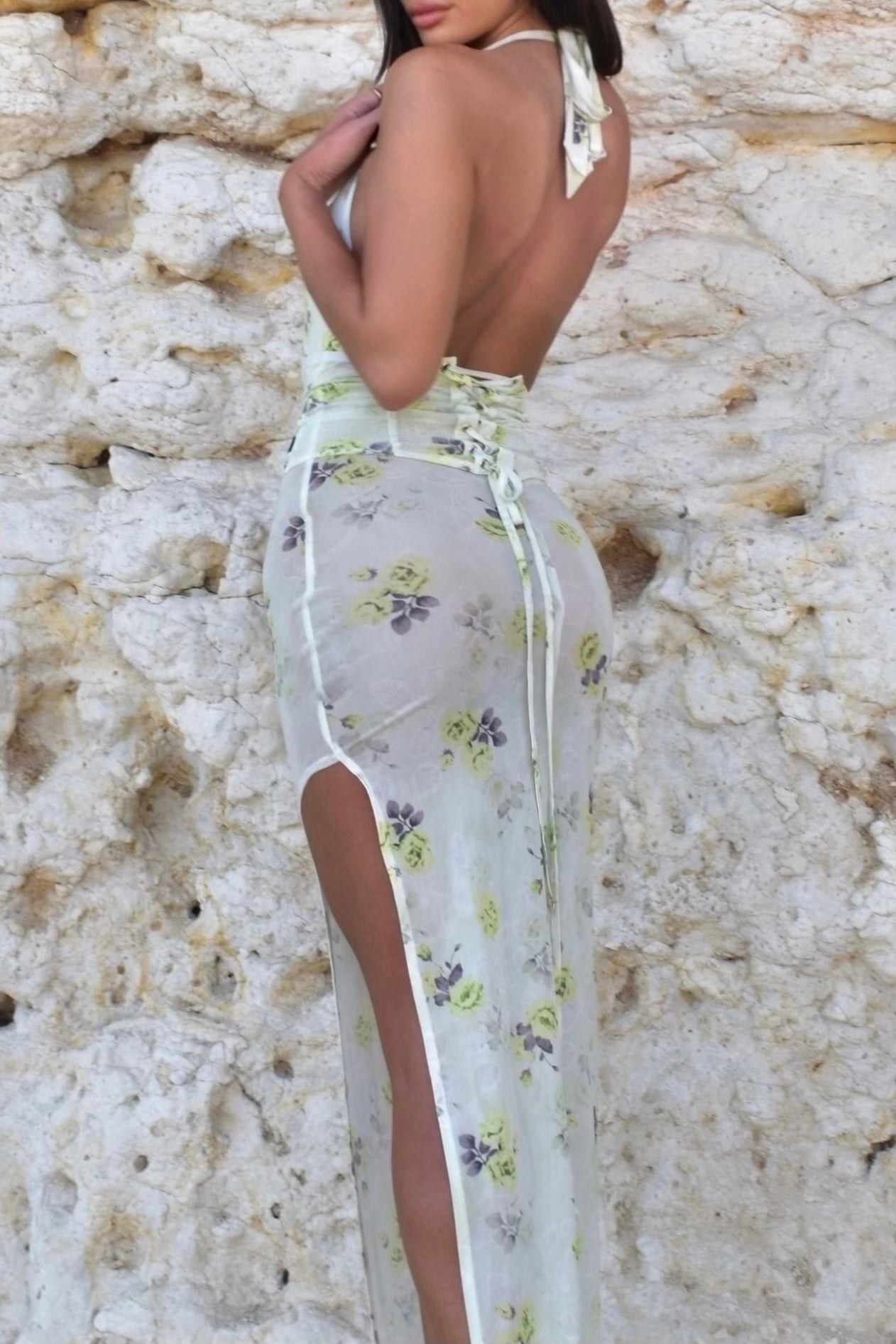 Make an unforgettable entrance with the Ira Pattern Maxi Dress, a stunning full-length gown featuring a sculpted bustier bodice, slender adjustable straps, and cascading tiered skirt with playful high slits. Crafted in lightweight white fabric adorned with dreamy green floral print, each piece is thoughtfully designed in the UK as part of our Summer de Piedra collection. Don’t miss your chance to own this exclusive summer masterpiece