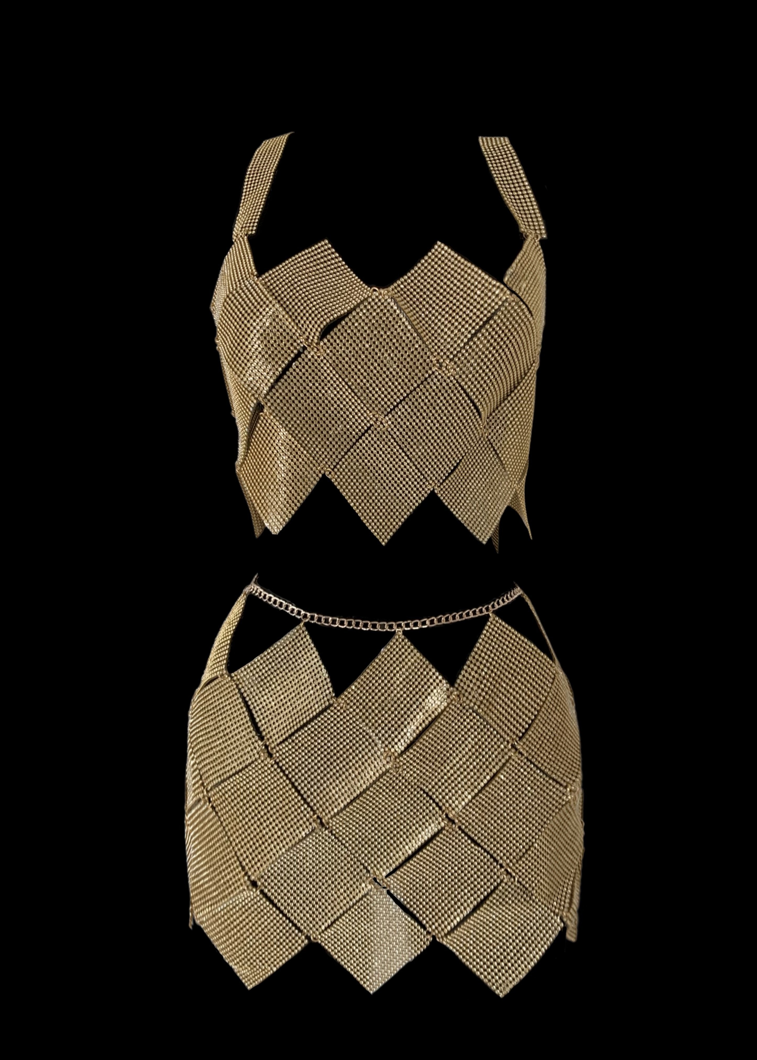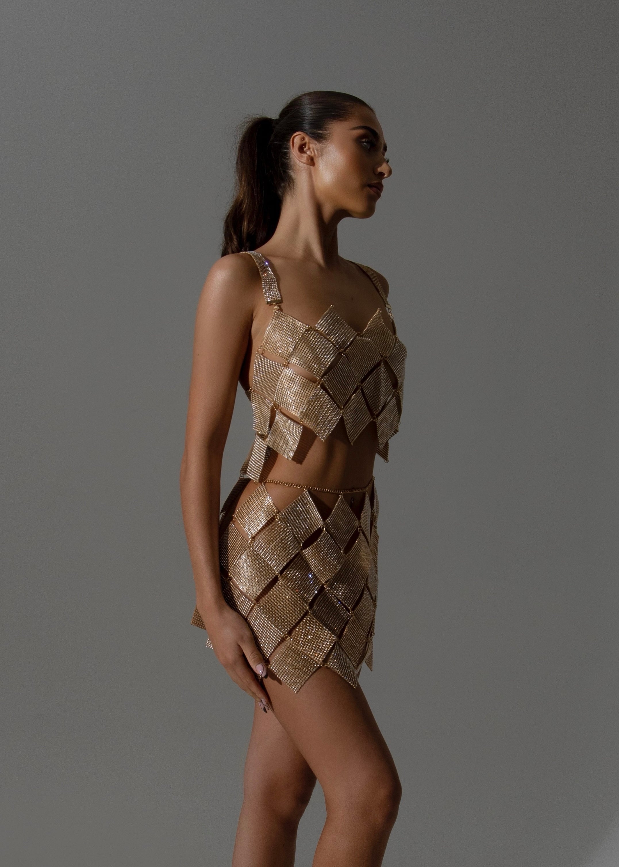 Please note: this dress is handmade from a rhinestone and aluminium fabric, making it extremely delicate with no stretch. If you are in between sizes, especially in the hips area, please purchase a size up. Due to the delicate nature of the material, we ask that you treat the garment with care and avoid applying extreme tension to the fabric.