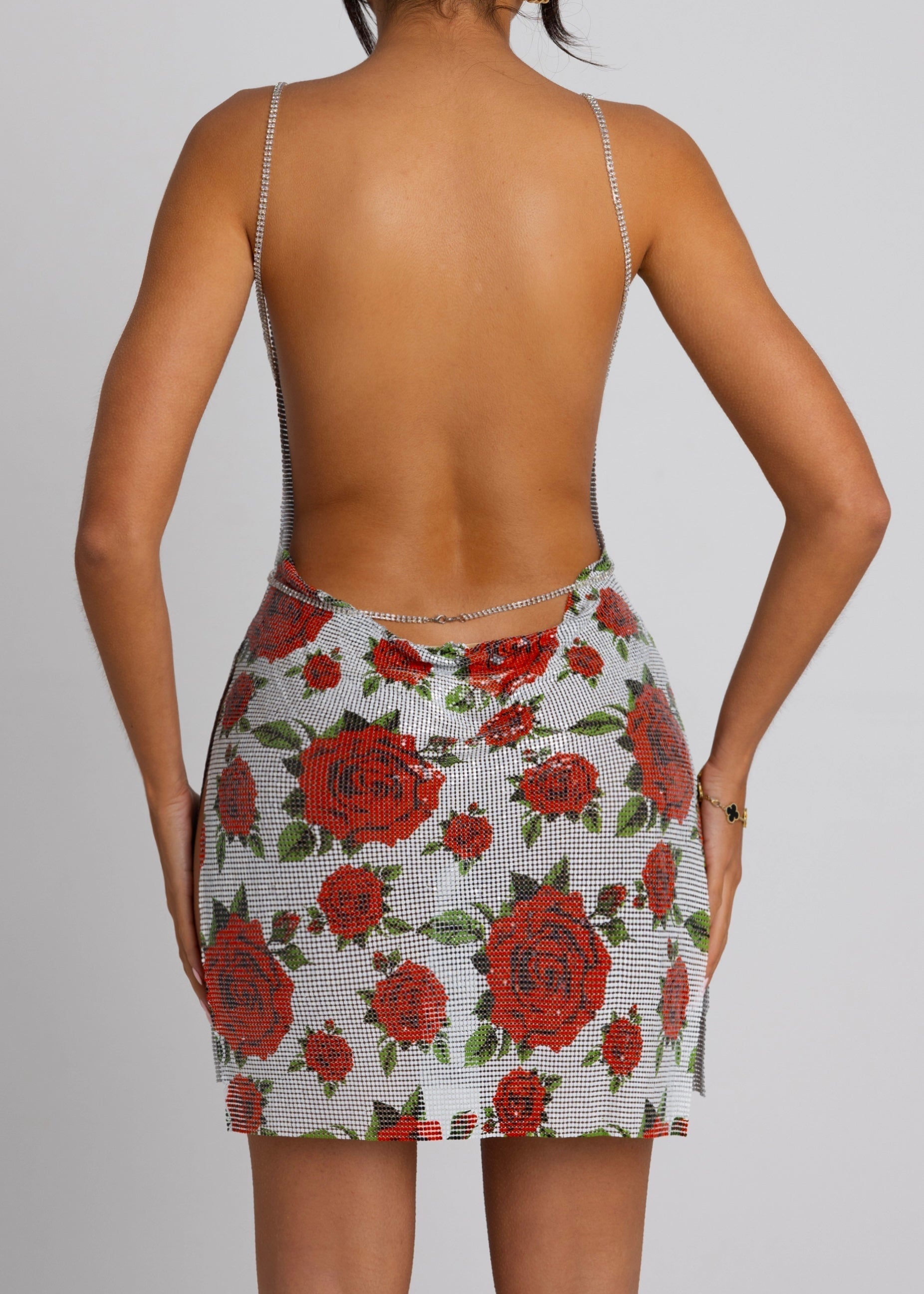 Please note: this dress is handmade from a rhinestone and aluminium fabric, making it extremely delicate with no stretch. If you are in between sizes, especially in the hips area, please purchase a size up. Due to the delicate nature of the material, we ask that you treat the garment with care and avoid applying extreme tension to the fabric.