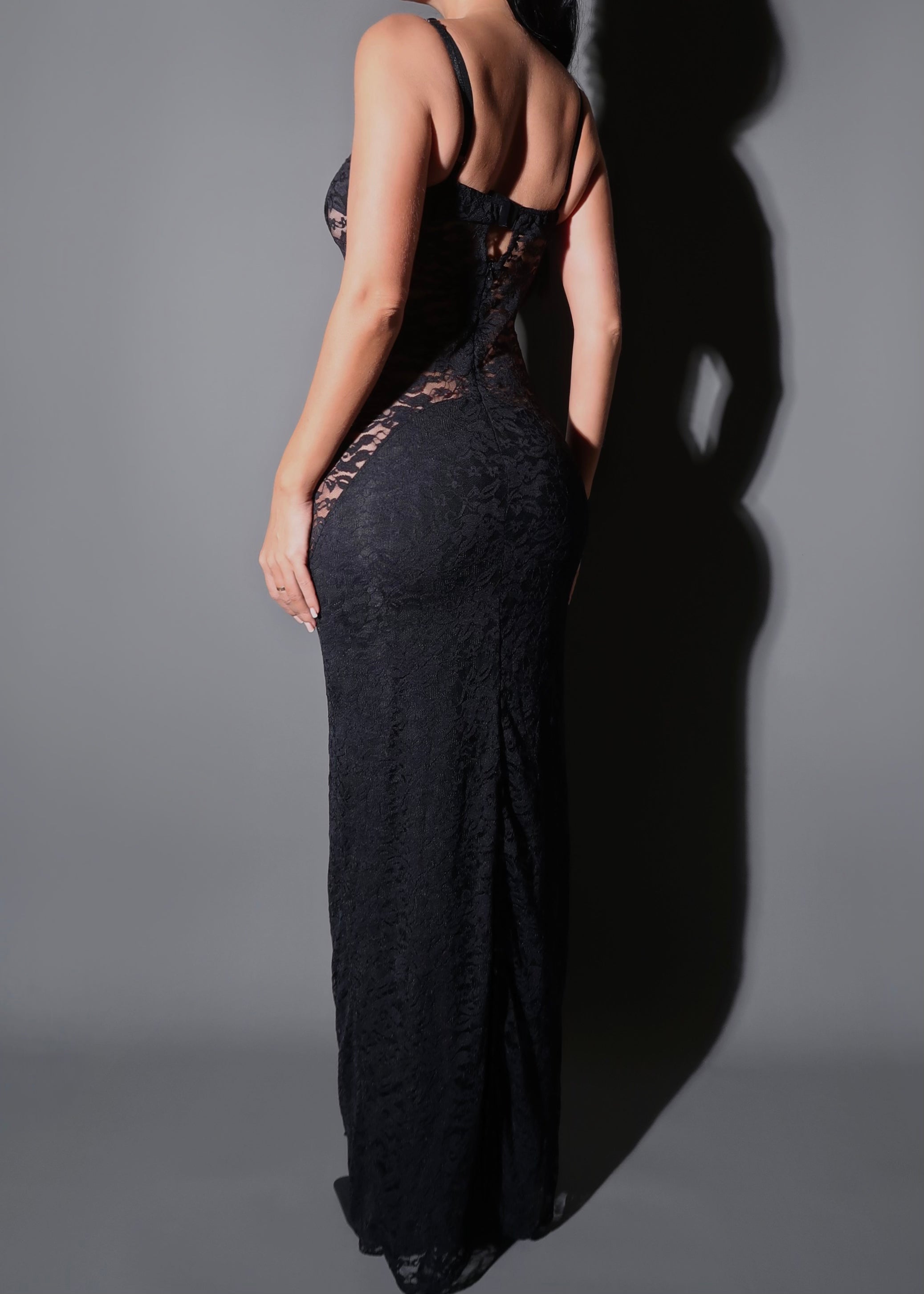 Made from our luxurious lace fabric for a premium feel. Designed for sculpting curves. LINA features a black lace fabric with a lace tie side detailing, sculpting design & maxi length.