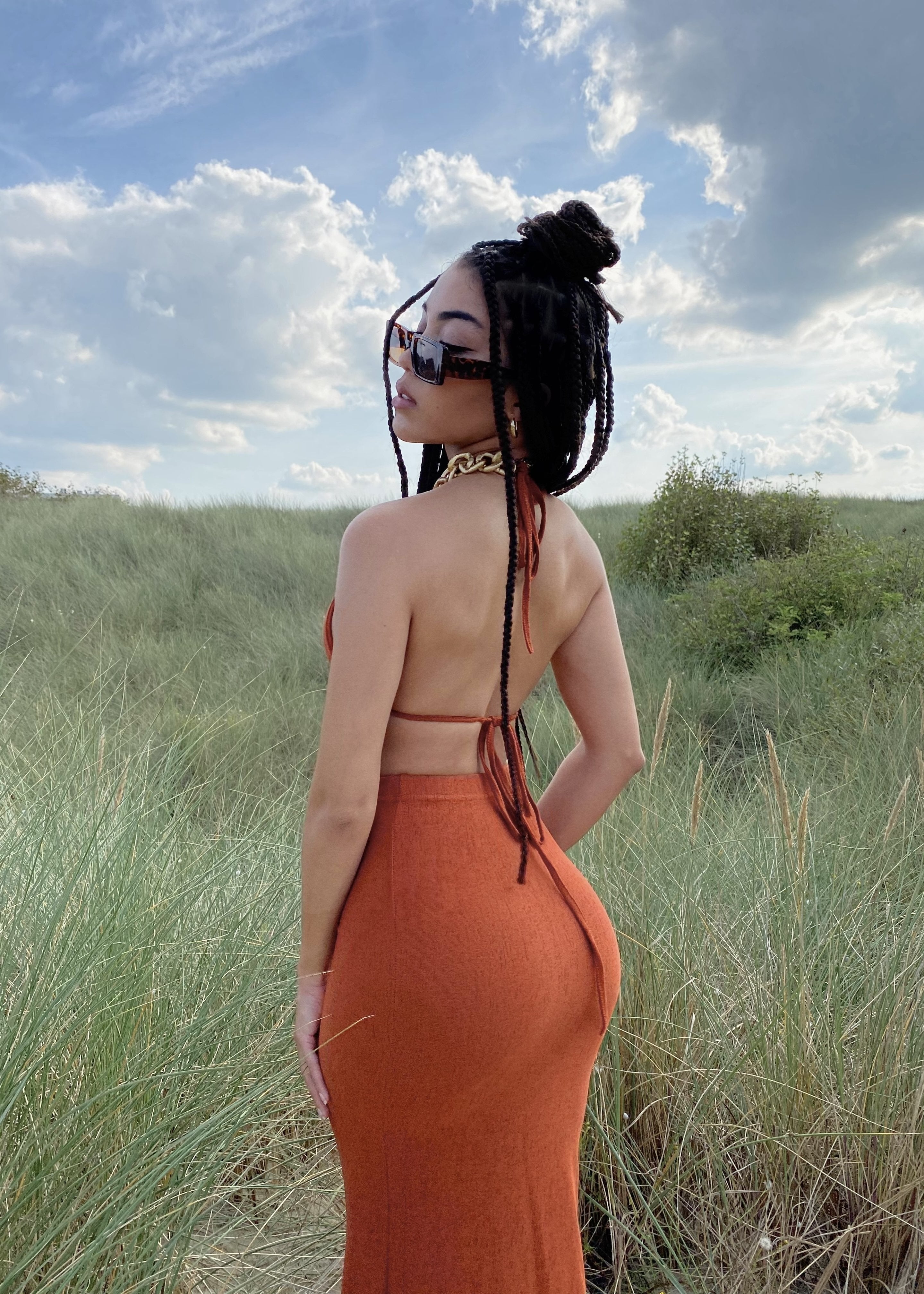 Add chic vibes to your beach look with this maxi two piece. Featuring a brown fabric, we love this team with some strappy heels for a luxurious combo.