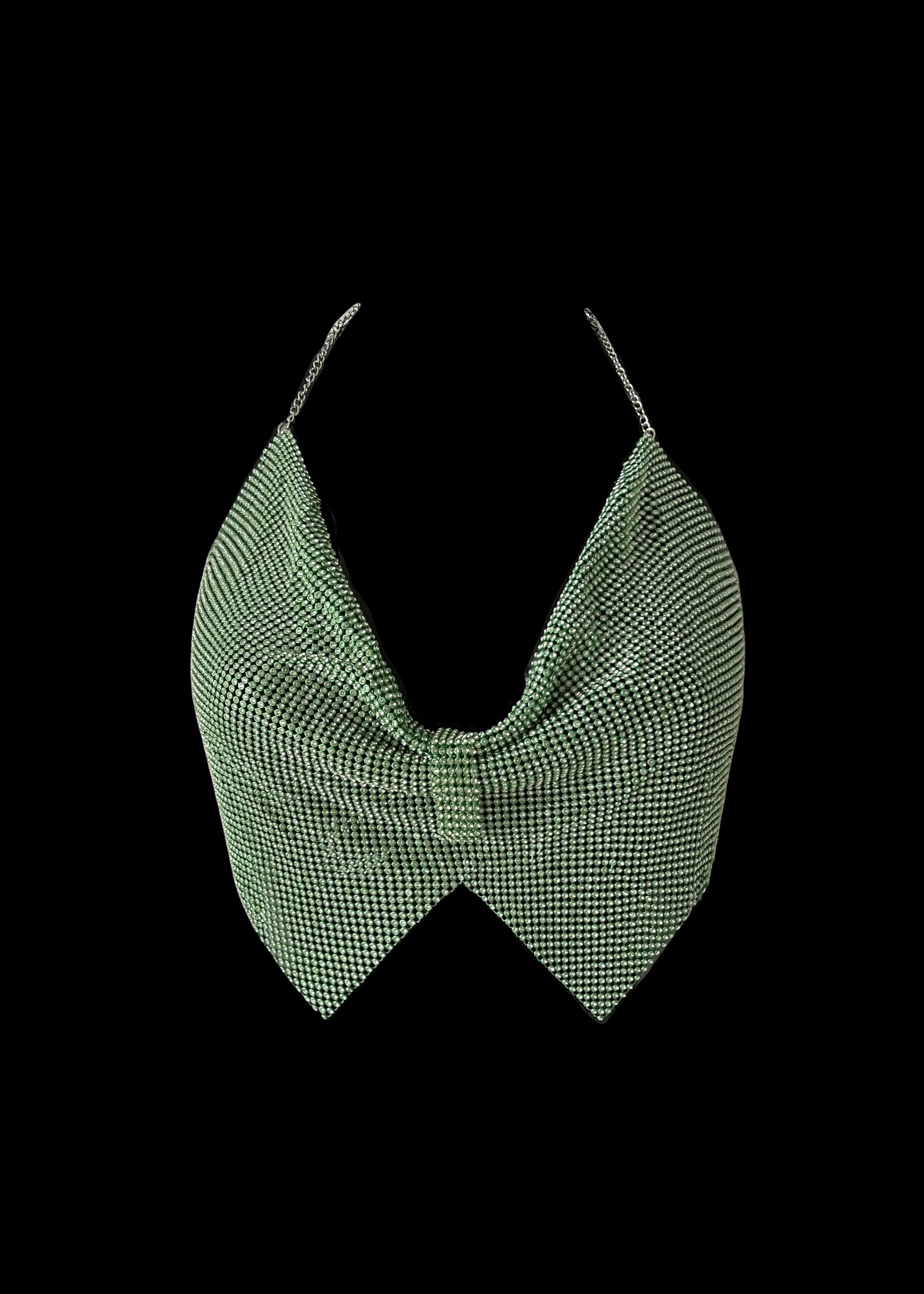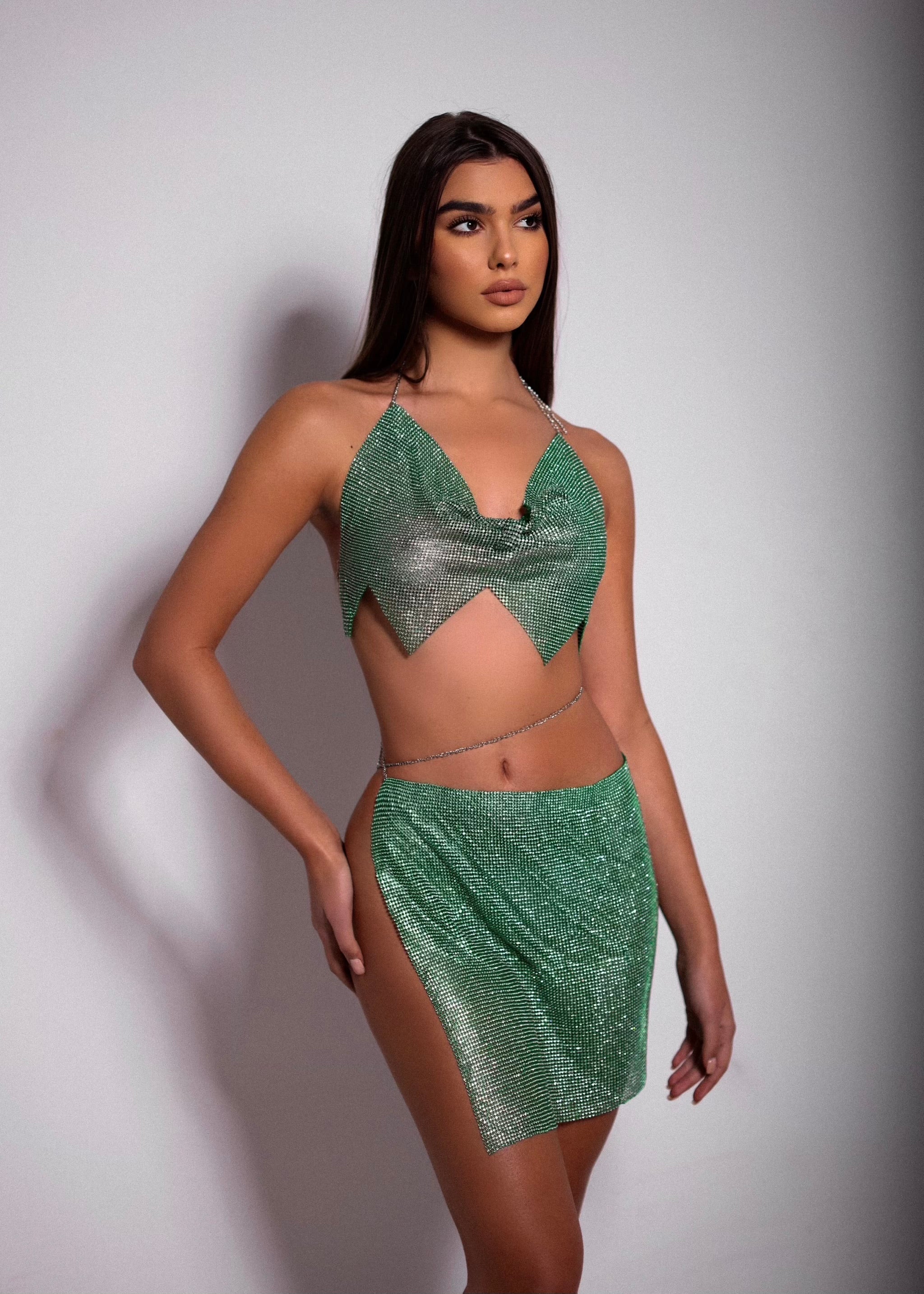 Bring the drama to your next event in the NATALIE Diamante Top. Designed with elegance in mind, Natalie features a draped v neck adorned in green diamante detailing.