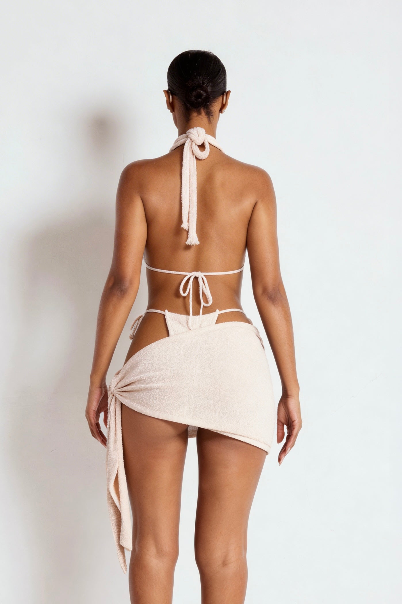 Live out your island girl dreams in our crochet 3 piece bikini set. Featuring a beige crochet fabric. This crochet set was made for dreamy summer vacay days. Style yours simply with some gold accessories and lace-up sandals. Island life is better, babe.