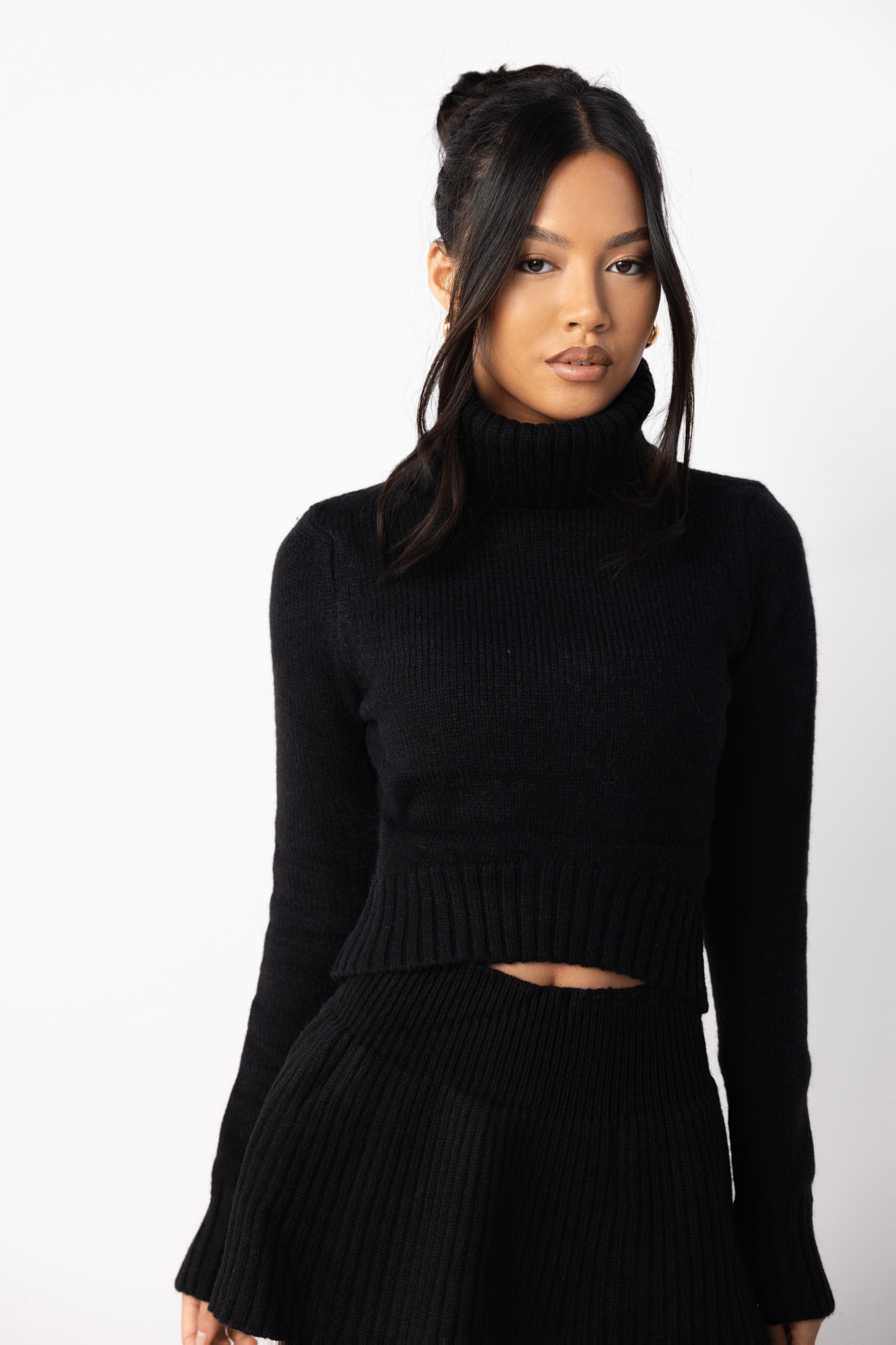 We are all about the knit feels this season and this set is about to earn you some serious style points. Featuring a Black ribbed knit material with a high neck cropped jumper / top and a matching skater mini skirt.