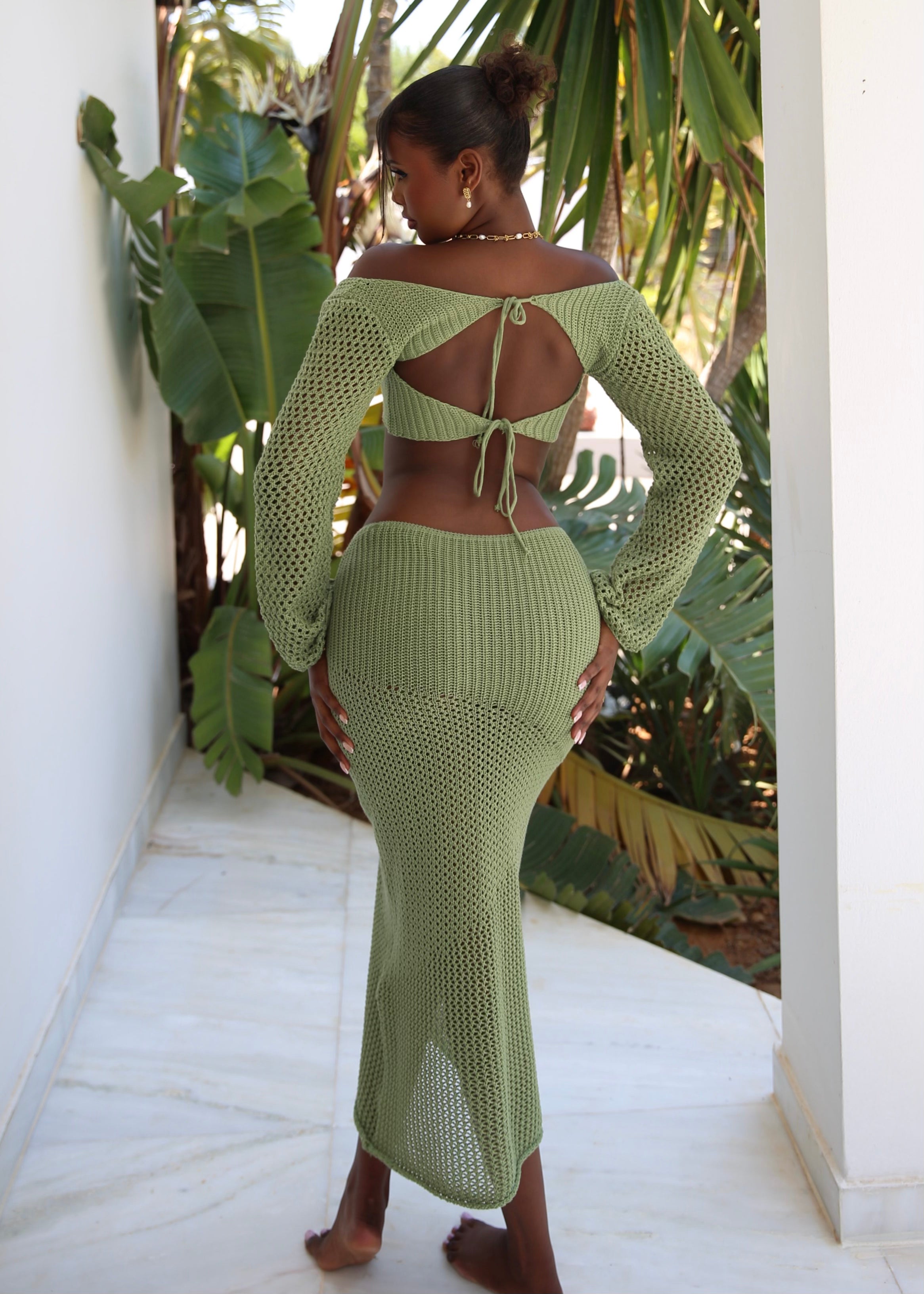 Nail new season trends with this set. Featuring a green crochet / knit material with a long sleeve crop top design cut out details and a matching skirt with a maxi length.