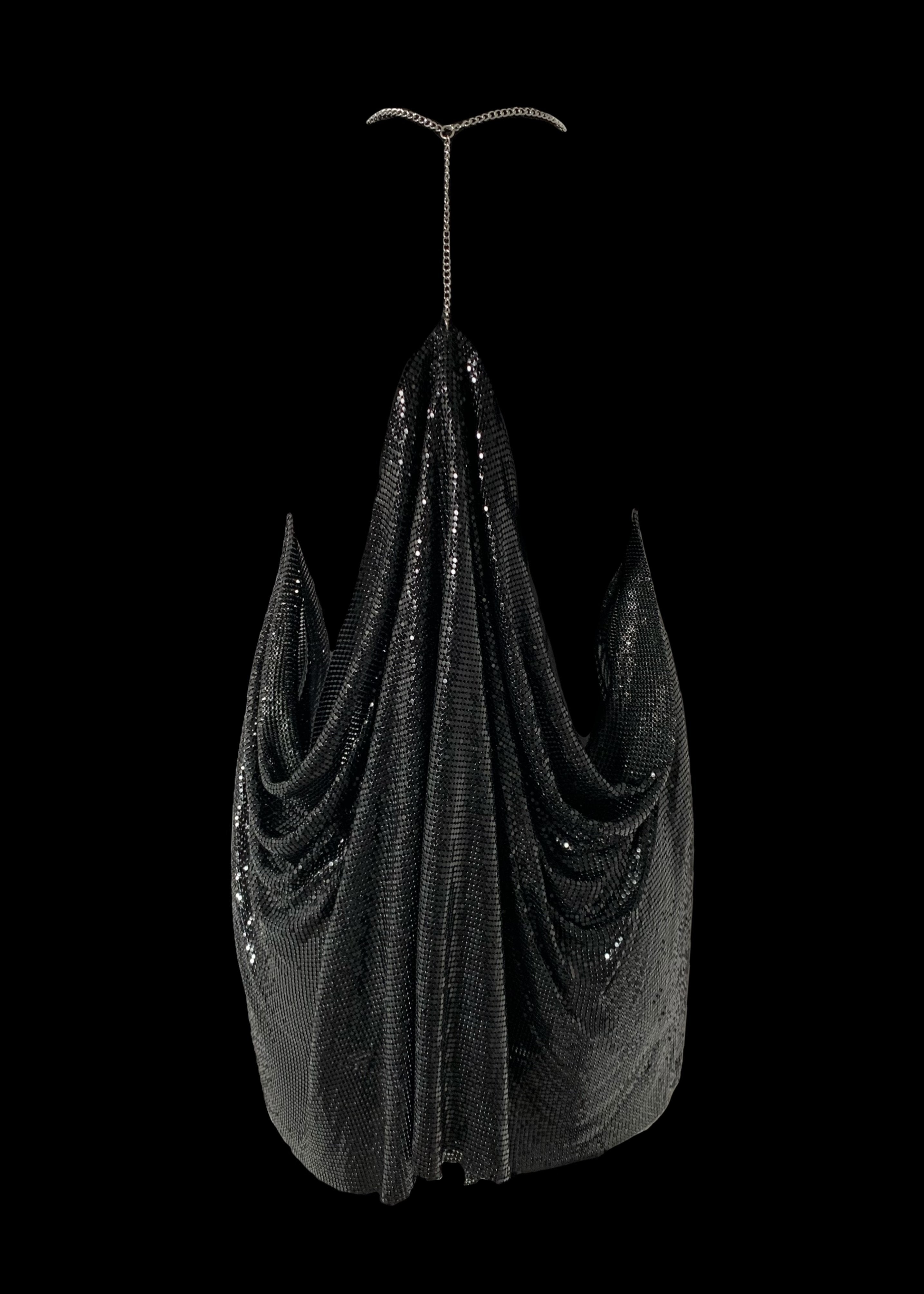 Please note: this dress is handmade from a rhinestone and aluminium fabric, making it extremely delicate with no stretch. If you are in between sizes, especially in the hips area, please purchase a size up. Due to the delicate nature of the material, we ask that you treat the garment with care and avoid applying extreme tension to the fabric.